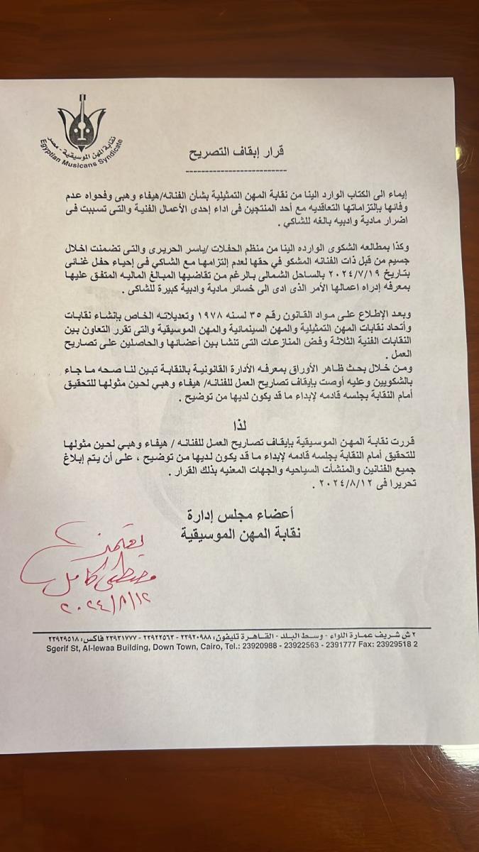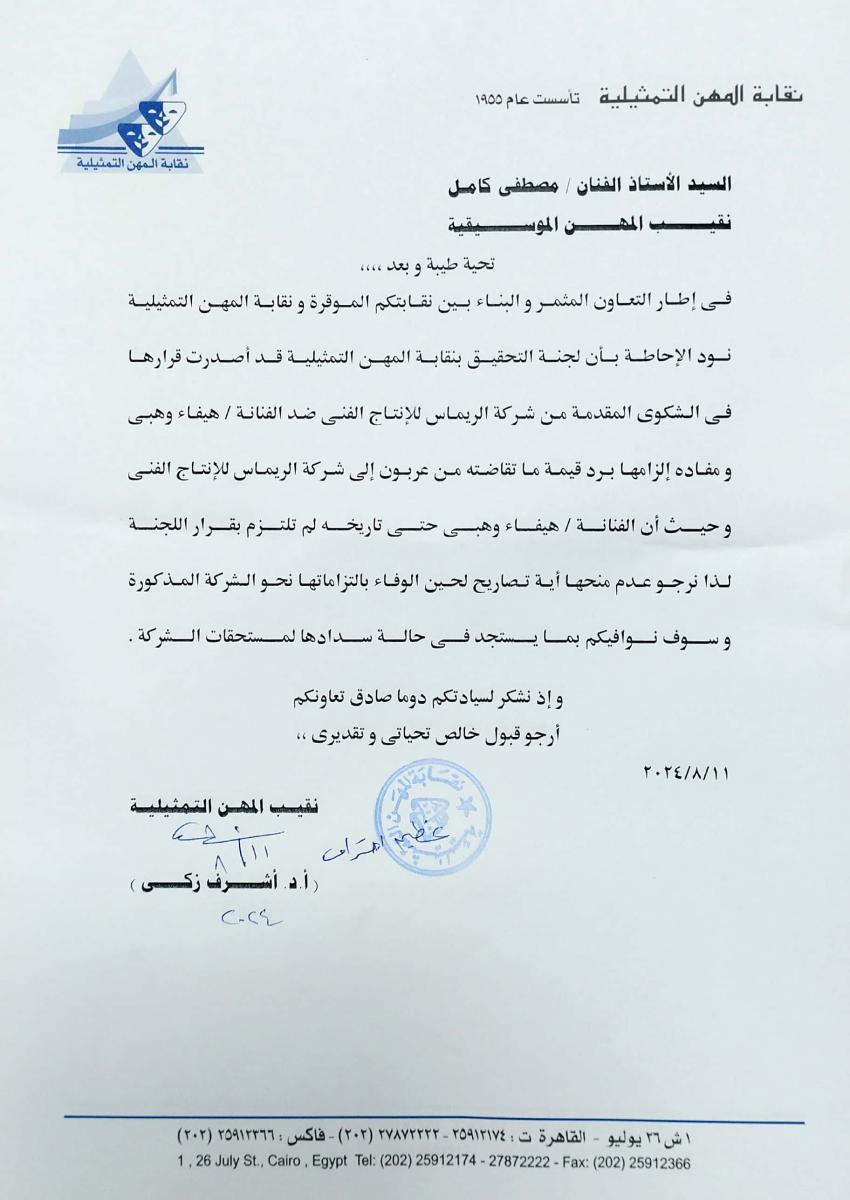 As representatives of the Federation of Artistic Syndicates, Ashraf Zaki of the Actors Syndicate and Mustafa Kamel of the Musicians Syndicate issued an official letter. After suspending artist Haifa Wehbe from work and preventing her from obtaining a new license, Ashraf Zaki asked Mustafa Kamel to activate the Federation of Syndicates by requiring the legally, morally, and administratively imposed cooperation.