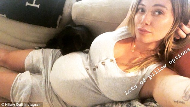 The 30-year-old actress flaunted her growing baby bump in the photo, adding the caption: 'Lots of pillow options.'