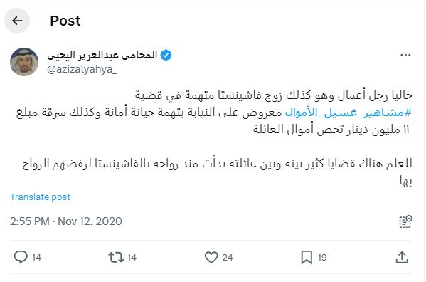 Years ago, an X user posted regarding Fouz Al Fahad's dispute with her family: "Currently, a businessman and a husband of a fashionista accused in the case of #MoneyLaundering. He is before the prosecution on charges of betrayal of trust, as well as stealing an amount of $12 million belonging to the family’s money. For your information, there are many cases between him and his family that have begun since his marriage because they refused their marriage."