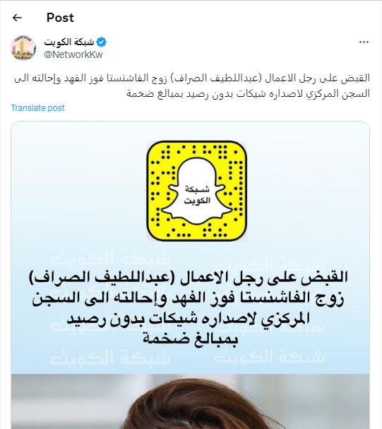 Kuwait Network account claimed on X (formerly Twitter) that Kuwaiti businessman Abdul Latif Al-Sarraf was arrested and referred to the central prison on charges of issuing checks without balance for huge sums.