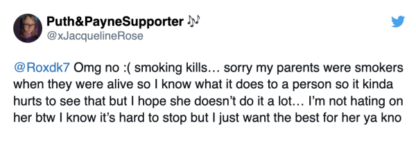 One user was worried about the actress and defended her, the user wrote: "@Roxdk7 Omg no :( smoking kills… sorry my parents were smokers when they were alive so I know what it does to a person so it kinda hurts to see that but I hope she doesn’t do it a lot… I’m not hating on her btw I know it’s hard to stop but I just want the best for her ya kno"