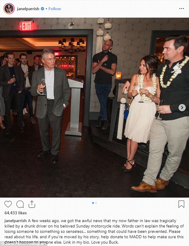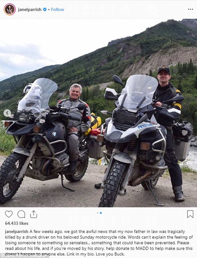 'A few weeks ago, we got the awful news that my now father in law was tragically killed by a drunk driver on his beloved Sunday motorcycle ride,' Janel began in the emotional post.