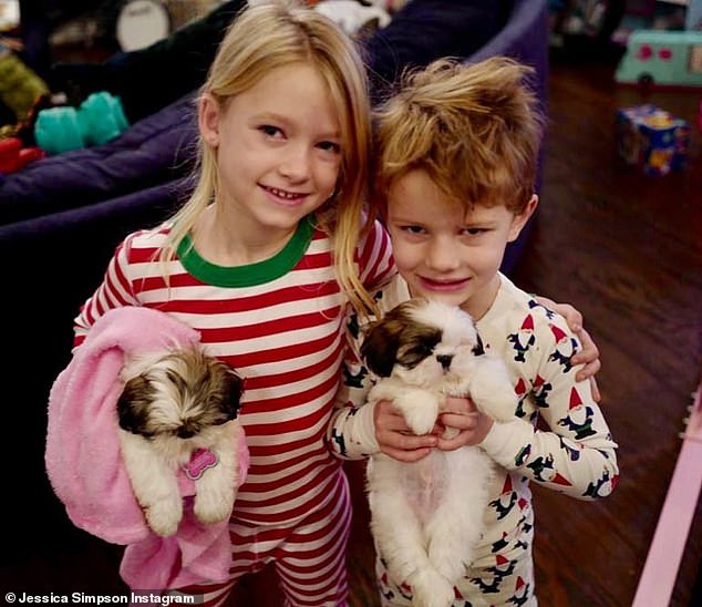 Expanding the family: Jessica went all out for Christmas, gifting Ace and his six-year-old sister Maxwell a pair of Shih Tzus and sharing a snap of the kids and dogs on Instagram