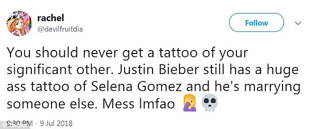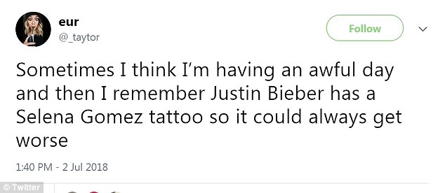 Sarcastic slam: One follower said the news of Justin still having a Selena tattoo made life better