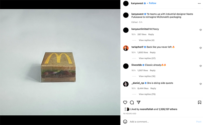 McDonald's has yet to comment on the collaboration and earlier in 2022, West collaborated in a McDonald's commercial for the Super Bowl.