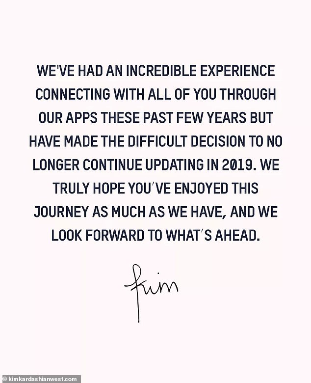 'We’ve had an incredible experience connecting with all of you through our apps these past few years but have made the difficult decision to no longer continue updating in 2019,' Kim Kardashian said on her official website on Wednesday.