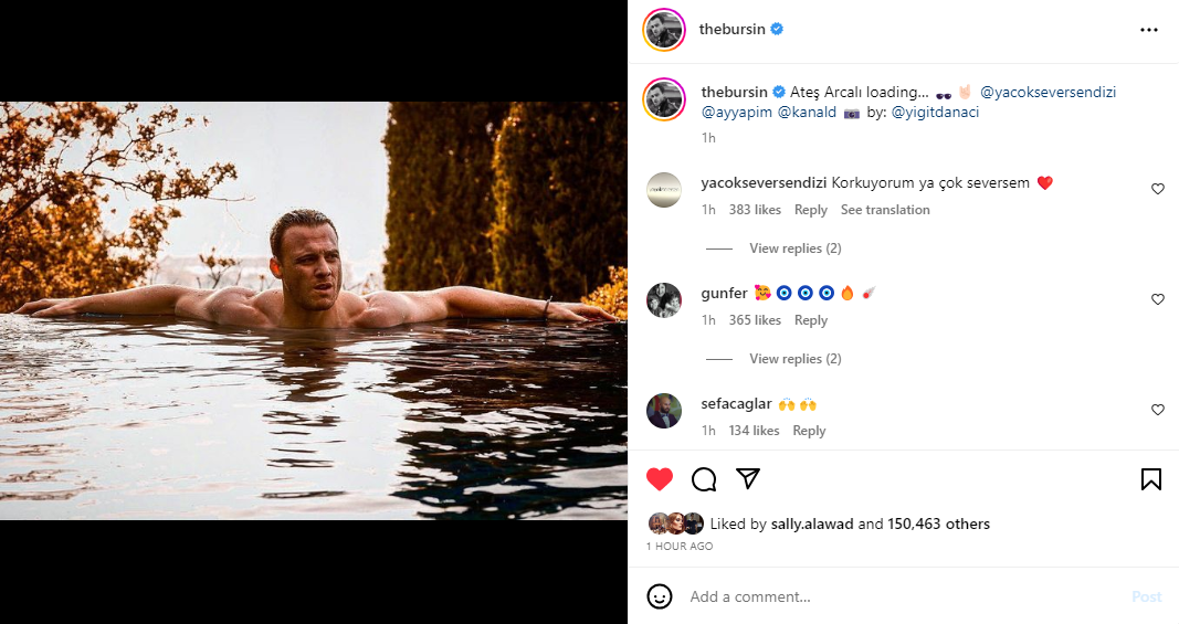Bürsin shared the picture which showed him in a pool and wrote: "Ateş Arcalı loading." Ateş Arcalı is his new character name in the new Turkish series.