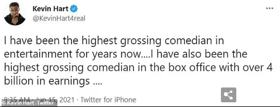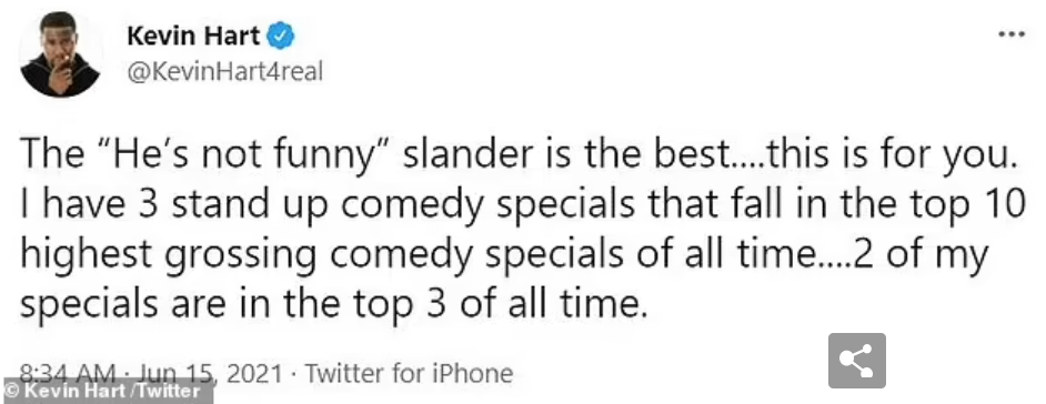 'The “He’s not funny” slander is the best....this is for you. I have 3 stand up comedy specials that fall in the top 10 highest grossing comedy specials of all time....2 of my specials are in the top 3 of all time,' posted.
