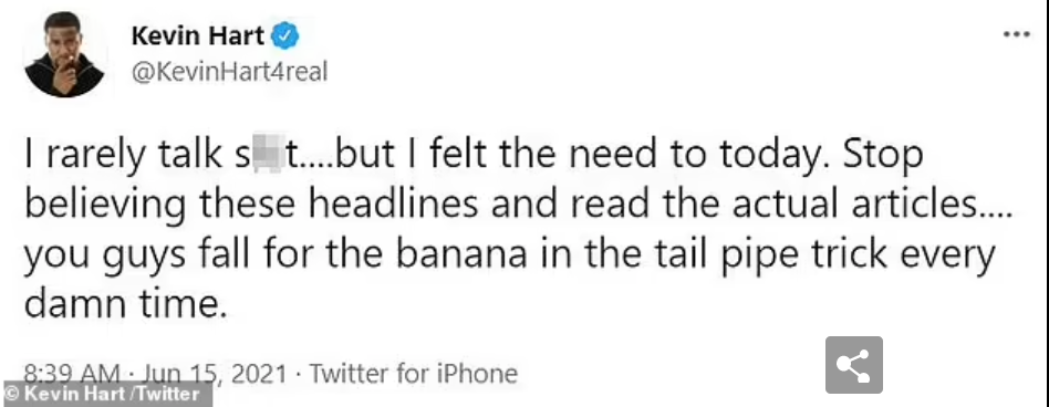 'I rarely talk s***....but I felt the need to today. Stop believing these headlines and read the actual articles.... you guys fall for the banana in the tail pipe trick every damn time,' Kevin added.