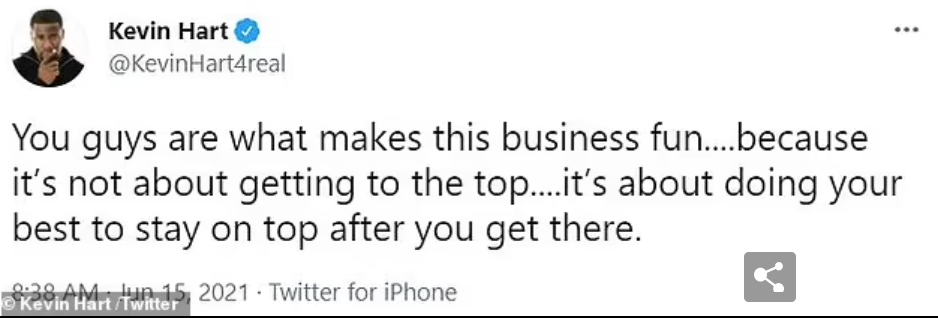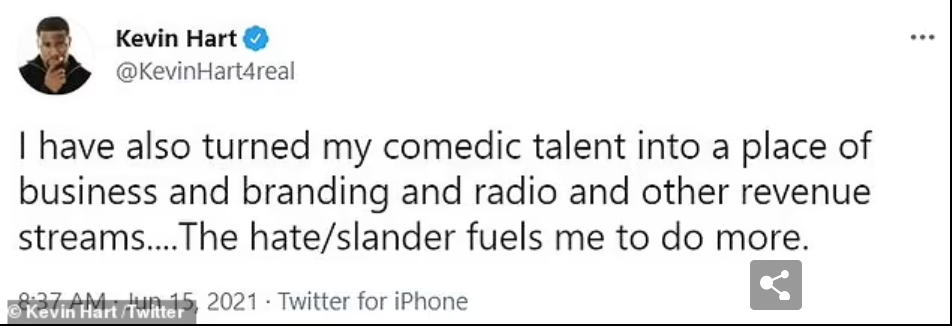 'I have also turned my comedic talent into a place of business and branding and radio and other revenue streams....The hate/slander fuels me to do more,' Kevin continued.
