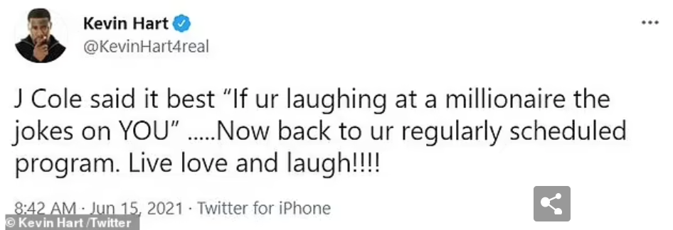 'J Cole said it best “If ur laughing at a millionaire the jokes on YOU” .....Now back to ur regularly scheduled program. Live love and laugh!!!!,' he posted.