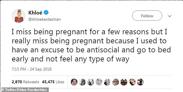 She wrote: 'I miss being pregnant for a few reasons but I really miss being pregnant because I used to have an excuse to be antisocial and go to bed early and not feel any type of way.'