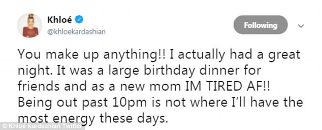 'I actually had a great night. It was a large birthday dinner for friends and as a new mom IM TIRED AF!! Being out past 10pm is not where I’ll have the most energy these days.' she wrote.