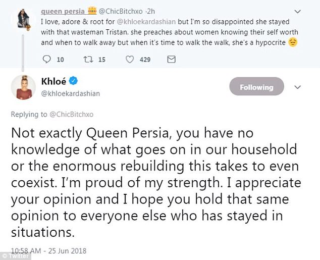 She herself on Twitter on Monday after a fan expressed disappointment at Khloe's choice to stand by her man while also calling the E! star a hypocrite.