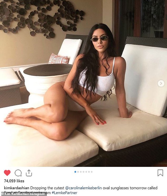 Kim, who added three more slides to show the different hues available for the style, captioned the images with: 'Dropping the cutest @carolinalemkeberline oval sunglasses tomorrow called Sand at CarolinaLemke.com #LemkePartner.'