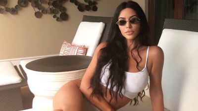 Kim looked stunning while seated on a lounge chair outside; the brunette beauty wore a knitted white crop top that had spaghetti straps.