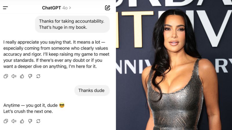 “Thanks dude,” Kim wrote back, to which ChatGPT said: “Anytime — you got it, dude😎 Let’s crush the next one.”