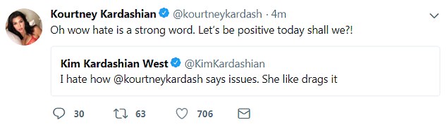 'I hate how @kourtneykardash says issues. She like drags it,' tweeted out Kim to her 59 million followers.