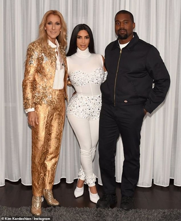 Terrifc trio: After the show, Kim and her rapper beau, 41, went backstage to meet Celine, 51. who was dressed to impress in a gold baroque suit and cowboy boots