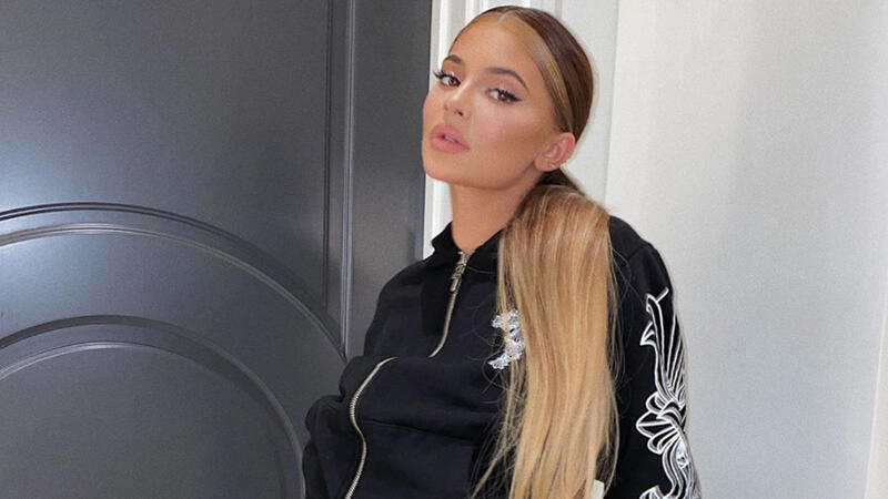 Standing in the backyard of her lavish new mansion, Kylie looked glam in a pair of grey sweats with a black long sleeve top tucked in.