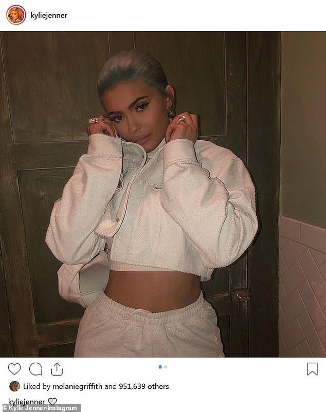Jenner was pictured wearing a white cropped coat over an off-white cropped turtleneck and white sweats.