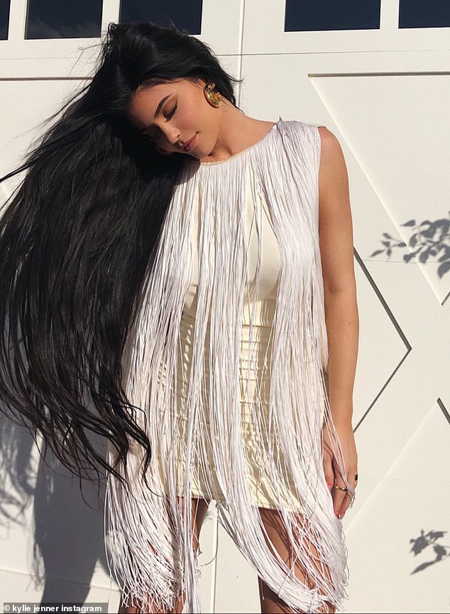Form fitting: The 5ft6in Keeping Up With The Kardashians star shows off a lovely fringe dress in the outdoor photo, composed of a cream-colored mini dress and long white strands