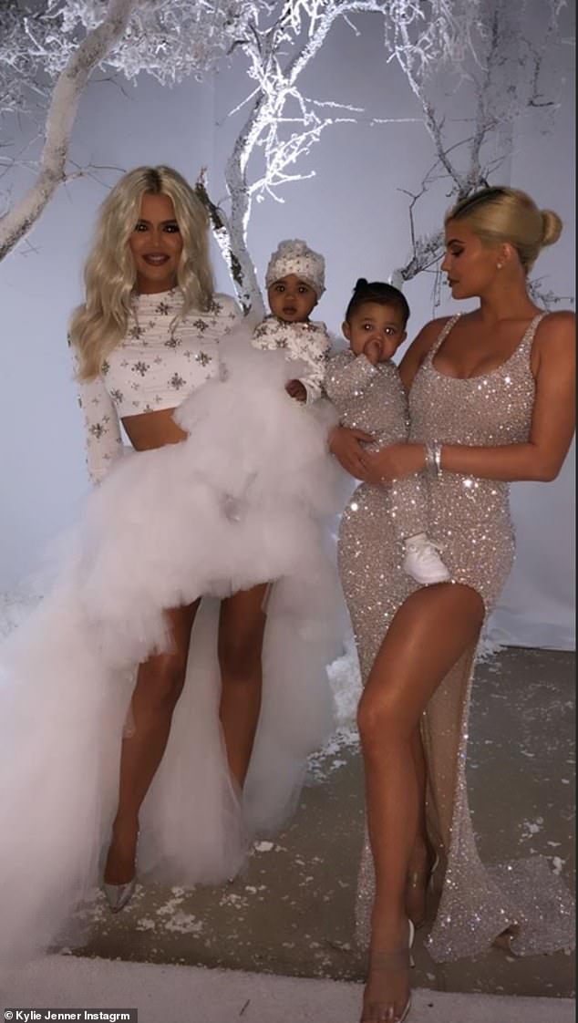 Family: Kylie looked incredible in a silver gown while posing with her daughter at the annual Kardashian-Jenner Christmas Eve party; pictured with sister Khloe Kardashian and her daughter True Thompson, eight months