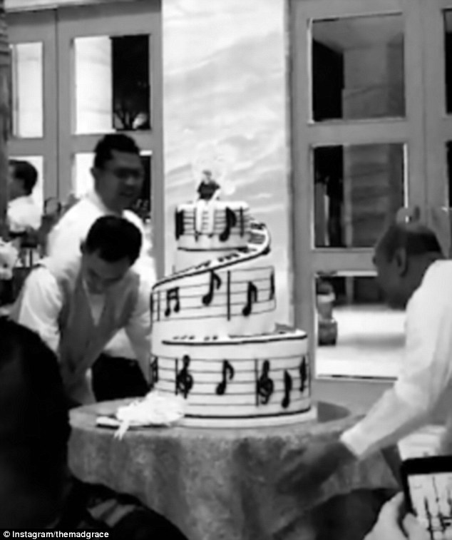 One of the night's highlights came when hotel staff wheeled a giant three-tier cake, decorated with a black fondant musical score into the party, as the guests belted out Happy Birthday.