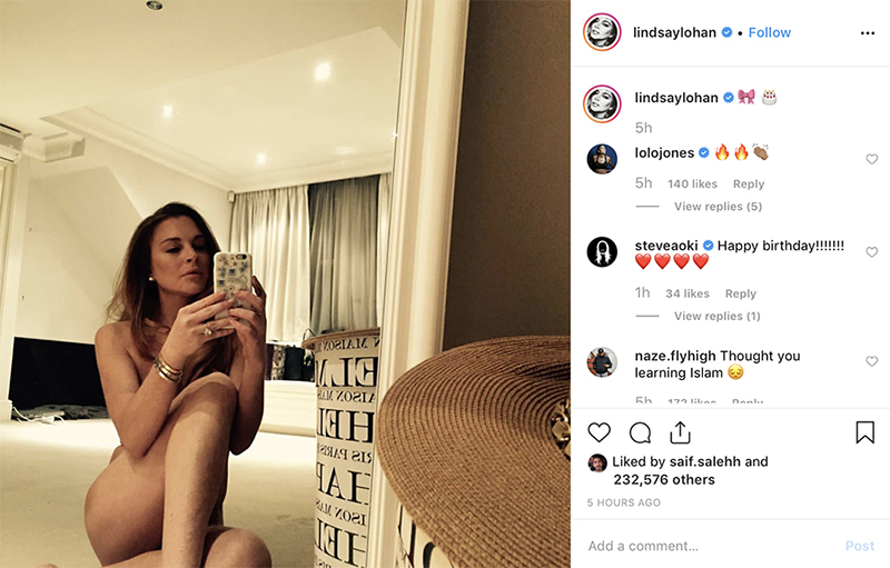 Lindsay Lohan Celebrates Birthday by Sharing Nude Selfie