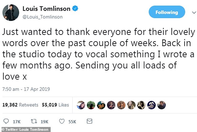Breaking his silence: Louis tweeted last week: 'Just wanted to thank everyone for their lovely words over the past couple of weeks. Back in the studio today'