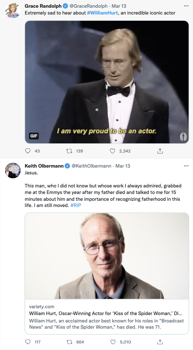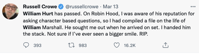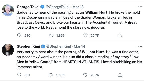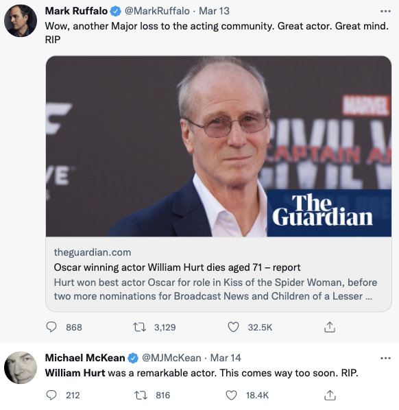 William's friends and colleagues took to Twitter to mourn the death of the actor, scroll down to see the heartwarming tributes.