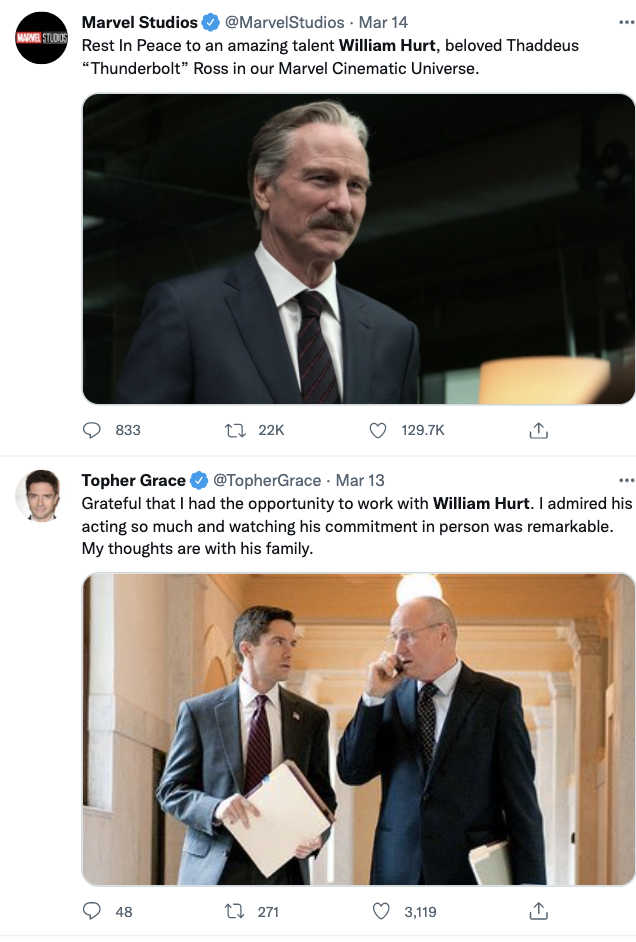 Hurt had been in Marvel Universe films playing the role of General Thaddeus Ross in motion pictures including 2008's The Incredible Hulk, 2016's Captain America: Civil War, 2018's Avengers: Infinity War, 2019's Avengers: Endgame and 2021's Black Widow.