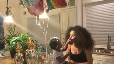The picture showed the one-year-old sitting on the counter surrounded by balloons and cupcakes.