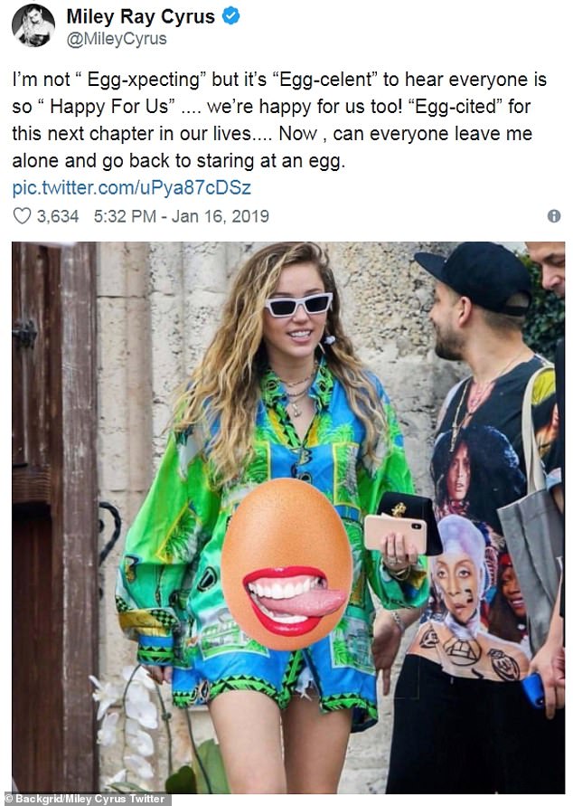 'I am not "egg-xpecting" but it's "egg-celent" to hear everyone is "so happy for us"... We're happy for us too! "Egg-cited" for this next chapter in our lives... Now can everyone leave me alone and go back to staring at an egg?' Miley tweeted Wednesday.
