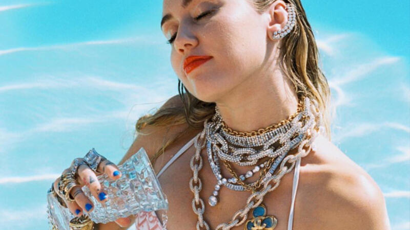 Cyrus was seated on a white lounge chair in the desert with the bare mountains and a smattering of drought proof plants in the background.