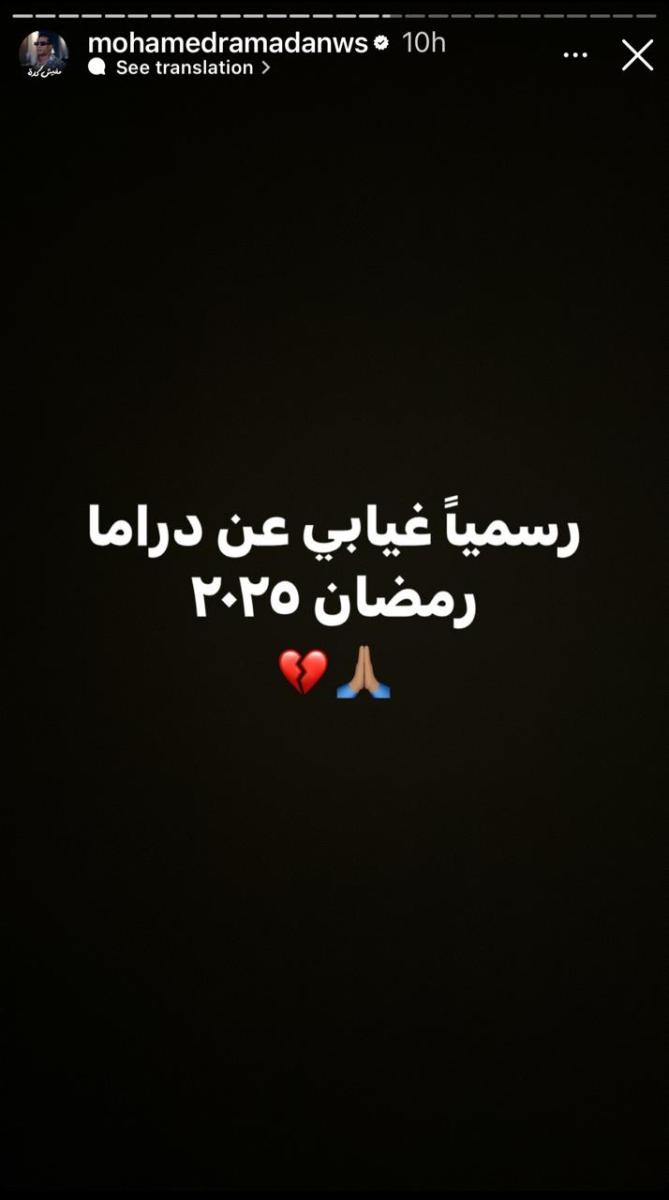 Declaring the news, Mohamed Ramadan said on both his official Facebook page and an Instagram account, "officially, I will be absent from the Ramadan 2025 drama."