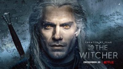 Cavill's poster shows the actor with white hair and golden eyes as Geralt, a witcher, or monster hunter. The character's wolf medallion appears alongside the show's title.