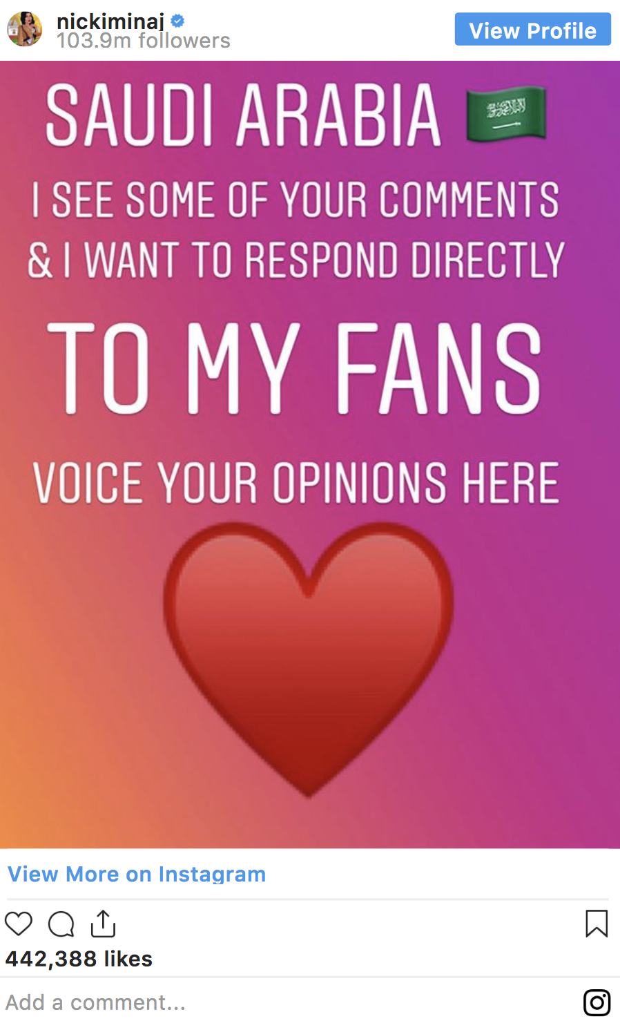 The rapper also shared a post on Instagram Tuesday afternoon, encouraging her fans in Saudi Arabia to share their opinions.
