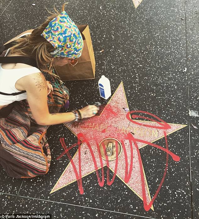 Do-it-yourself: Paris Jackson got down on her hands and knees to clean up her Michael Jackson's star on the Hollywood Walk Of Fame after it had been hit by vandals