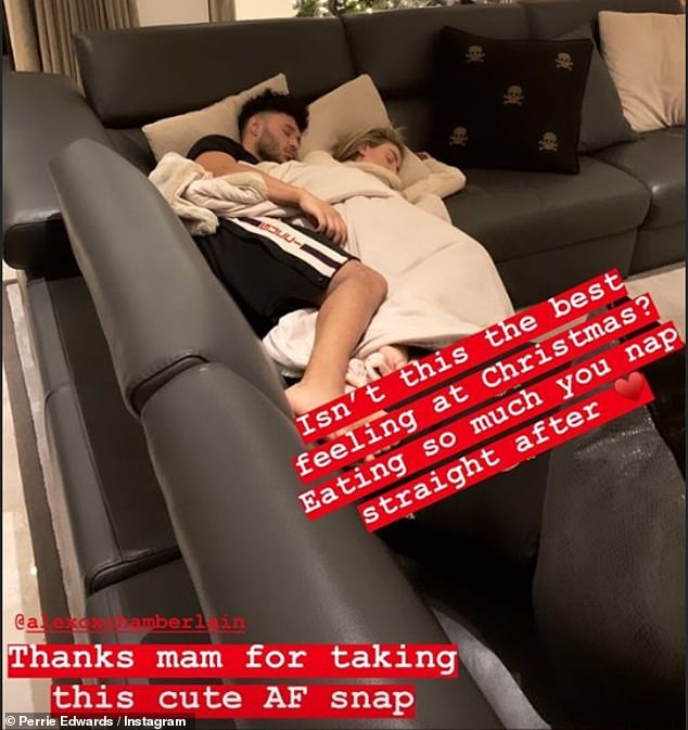 Revealing her mum had been behind the candid shot, she wrote: 'Isn't this the best feeling at Christmas? Eating so much you nap straight after
