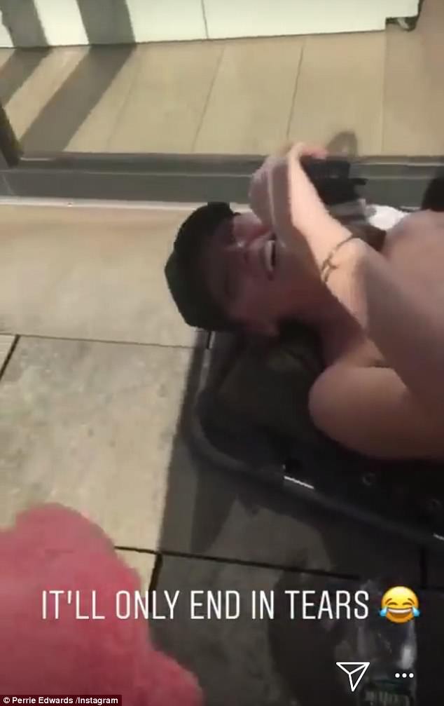 Whoops! Perrie Edwards, 24, shared a video of herself lying on the floor laughing, still in the chair, with the accompanying explanation: 'Note to self: Don't try do a high kick in a recliner deck chai