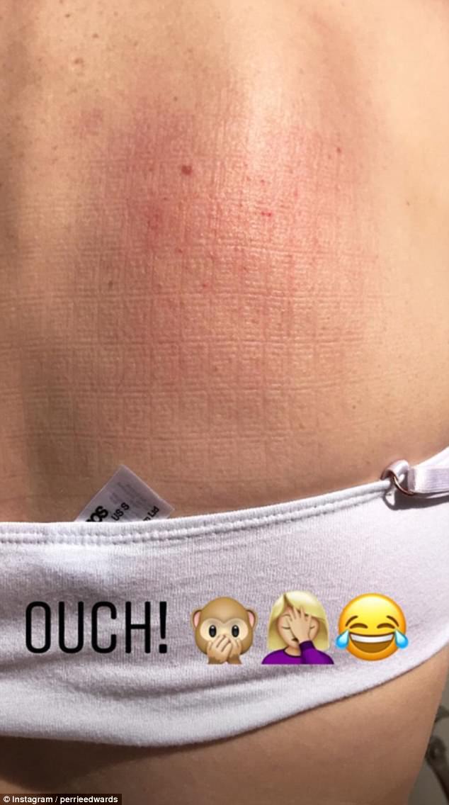 She then posted a snap of what appears to be the red mark left after her fall in the chair, which the caption 'ouch!'