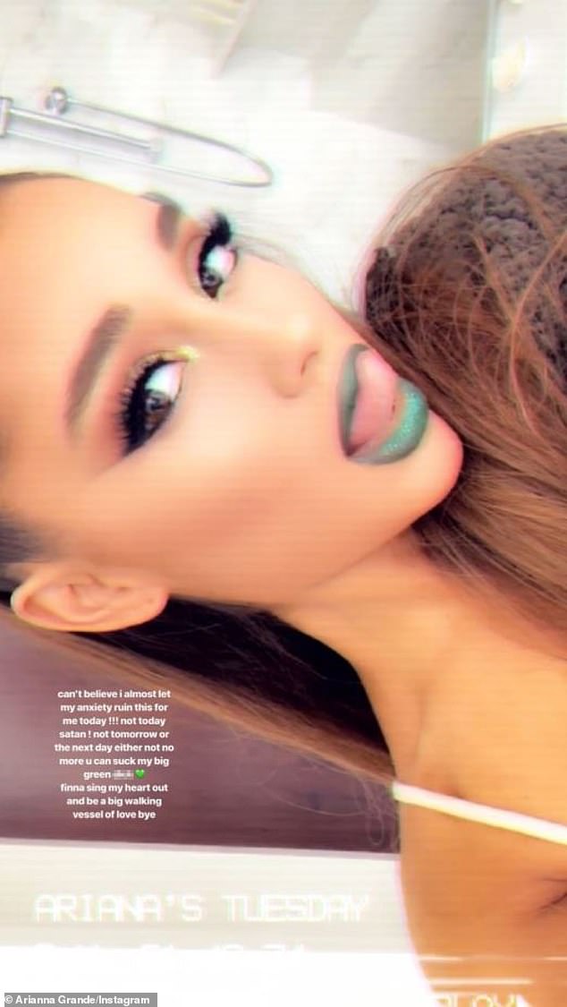 After performing, she shared images of herself in full makeup including green lipstick to Instagram, sharing: 'Can’t believe I almost let my anxiety ruin this for me today!'
