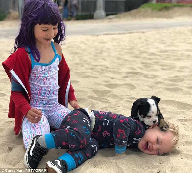 Purple hair: He also shared a snap in early June of Willow playing on the beach with brother Jameson, 18, months, and their cute pup