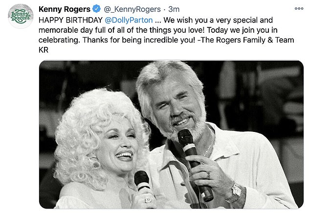 The family of later singer Kenny Rogers, a longtime collaborator of Parton's, celebrated by sharing a black and white photo of the duo and writing: 'HAPPY BIRTHDAY @DollyParton...
