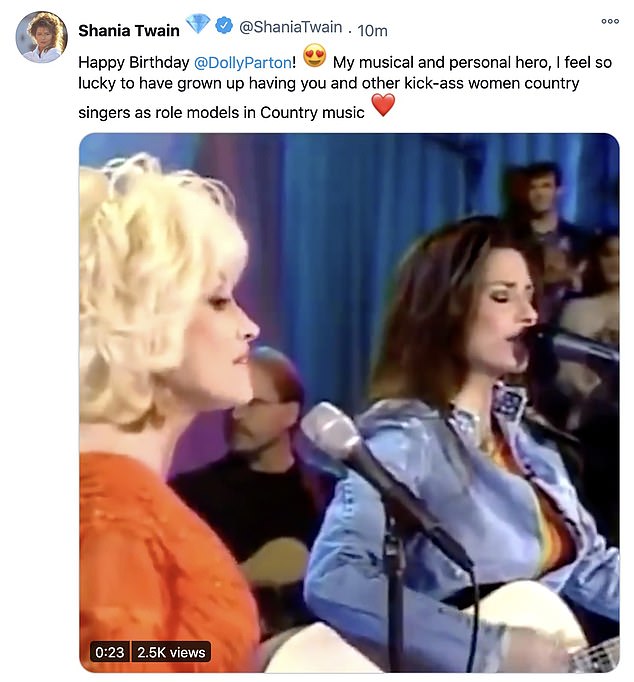 Fellow country superstar Shania Twain posted a video of the pair performing together along with the message: 'Happy Birthday @DollyParton.