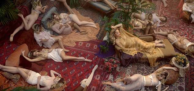 Rita sits surrounded by scantily-clad women cosying up to one another as writhes around and caresses her body on a chaise lounge.