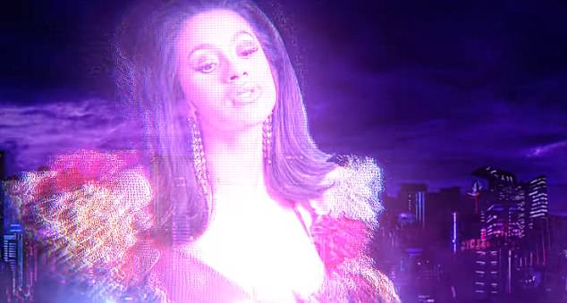 All eyes on her: Cardi caresses her chest as she raps her verse in a fur jacket and bra