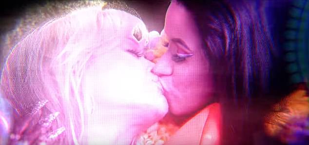 Raunchy: Rita sits surrounded by scantily-clad women cosying up to one another as writhes around and caresses her body on a chaise lounge