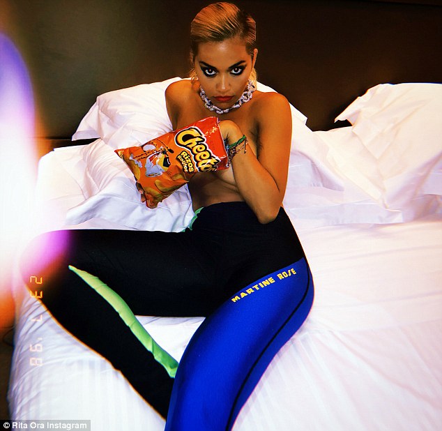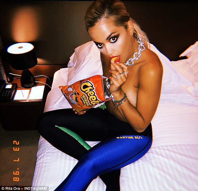 Rita treated herself after her performance to an indulgent packet of Cheetos when she arrived back in the hotel room.